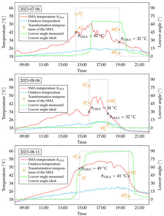 Measurement data of the full-scale demonstrator with the SMA-temperature and the louver angle (measured and calculated from the irradiation threshold values). Data are shown over the course of three exemplary days (6 July 2023, 6 August 2023, and 11 August 2023).