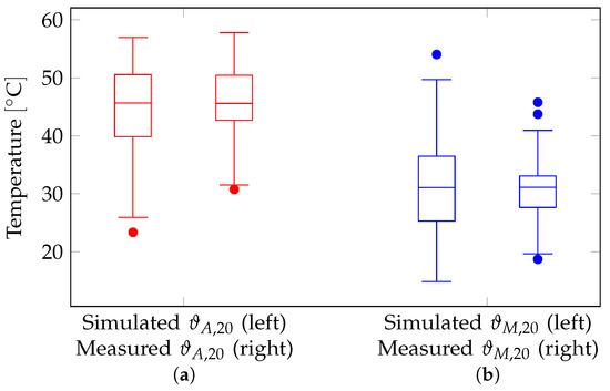 Figure 8 presents the results of the simulations for for one summer period from April 1 to September 30. The data distinguish between two variants: Figure 8a,b. In variant Figure 8a, temperatures of the SMA wire are provided at the time when solar irradiation I reach the threshold values . In variant Figure 8b, temperatures were calculated 20 min after reaching the threshold values. We developed the second variant for a better estimation of the dynamics of temperature trends in the solar collector. Both variants differentiated between the events for closing (shown on the left in red) and opening (shown on the right in blue) of the louvers. The data exhibited a significant scattering of values. This was due to the fact that during cloudy periods, irradiation values on the facade surface could rise and fall abruptly. In contrast, the data in Figure 7 represent a mostly cloudless day, where solar irradiation I varies smoothly over the course of the day. The high scattering was thus attributed to the inertia of the solar collector during heating and cooling. Furthermore, it could be possible that on a cloudy day, could only be briefly exceeded or undershot. The sluggish behavior could help to avoid the rapid opening and closing of the louvers. Consequently, the differences in medians between and increased from K in variant Figure 8a to K in variant Figure 8b. The simulation data covered a whole summer period. Particularly low temperatures in the solar collector along with high irradiation values could be attributed to cold outdoor air temperatures. This granted the utilization of solar gains during cold seasons. Despite the high variability in the simulation results, the heating of the solar collector could be compared to the solar heating of indoor spaces. The goal of the sunshade construction system was to avoid overheating in rooms during summer. This implies that the dynamics of solar heating in the solar collector may behave similarly to the heating patterns of the protected rooms.