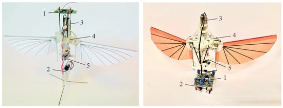 The robot COLIBRI. Left: early version with the control board on top []. Right: current configuration with the control board at the bottom. (1) Flight control board, (2) batteries, (3) main motor, (4) gearbox and flapping mechanism, (5) attitude control actuators.