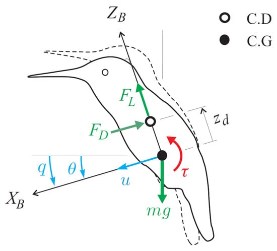 Previous studies have shown that, near hovering, the low-frequency dynamics of the hummingbird robot (say, below 10 Hz) can be modelled as a rigid body and that the weak coupling between the longitudinal (pitch) and the lateral (roll) dynamics allows to treat them as independent. The following discussion will be focused on the longitudinal dynamics; a similar treatment applies to the lateral dynamics (with appropriate values of the model parameters). Since the flapping frequency is high compared to the robot dynamics, the complexity of the aerodynamic forces acting on the robot can be ignored and they may be approximated by their cycle-averaged values; a similar approach was followed by [,,]. The rapid change in the aerodynamic moment as well as the lift and drag forces during a flapping cycle will appear as noise. Note that, if the aerodynamic forces along the lateral axis are self-balanced within a flapping cycle (due to left-right symmetry), it is not the case in the longitudinal axis, resulting in a significant pitch torque noise and drag forces. To alleviate this, Delft university has developed a flapper drone with four wings [] which is also self-equilibrated in the longitudinal axis; this architecture increases the lift with the so-called clap and fling mechanism and it considerably reduces the flapping disturbance. However, such a morphology does not exist in nature.