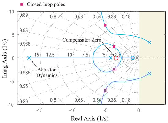 The open-loop longitudinal dynamics is unstable and the poles configuration (the eigenvalues of A) depends strongly of the value of . For (center of drag above the center of mass), the system has two unstable oscillatory poles and two poles on the negative real axis (blue × in Figure 3). If one considers the system as a SISO system with the control torque as input and the pitch angle as output, the system can be stabilized with a PD compensator, . This adds a zero in the open-loop system; Figure 3 shows the root locus as a function of the proportional gain . The position of the closed-loop poles corresponding to , 15 mm and is indicated in red [].