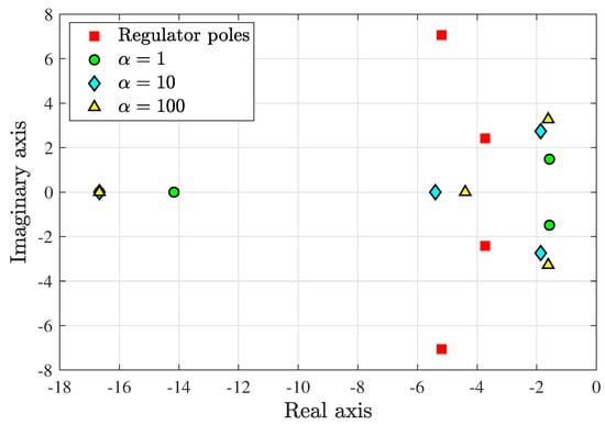 Observer poles for 1, 10 and 100 (the pole on the left side of the real axis is common to all values of ). The regulator poles of Figure 3 are also shown with red squares.