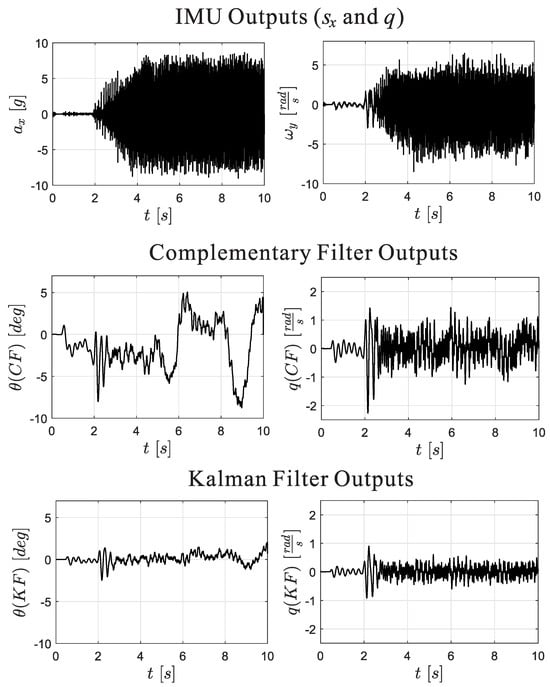 From the foregoing discussion, we conclude that the important components of the IMU outputs are (the x component of the accelerometer) and q (the y component of the gyro). Considering the system equation, Equation (5), the output equation relating the sensor output to the state vector reads