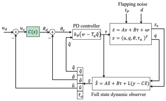From measurements reported in [], the variance of the drag noise and the pitch torque noise are estimated: (N/kg)2 and 200,000 (N/kg · m)2 (the components of the plant noise are expressed in different units; in SI units, their ratio is 100). The sensor noise covariance matrix may be estimated from the zero-acceleration output of the accelerometers and the zero-rate output of the gyros, available from the data sheet of the IMU sensor, 0.30 m/s2 and 0.085 rad/s, respectively, leading to (m/s2)2 and (rad/s)2, respectively. Thus the ratio . Figure 5 shows the block diagram of the longitudinal stability control loop with a full-state dynamic observer.