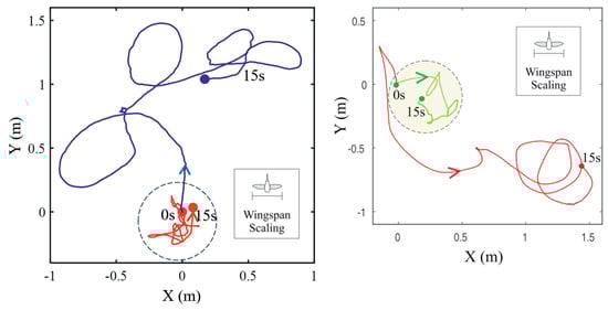 where the parameters and have been selected after numerical simulations to provide adequate stability margins [], and finally adjusted from flight tests. The proposed strategy looks fairly straightforward, but it was not obvious that it would work in practice, given the severe flapping noise affecting the IMU sensor. The flight tests have shown that it works as one can see one the short video []. The left side of Figure 9 compares trajectories of the center of mass of the robot with (in red) and without (in blue) velocity control measured by an external tracking system. The right side of the figure shows similar measurements conducted earlier when the velocity used in the feedback was that reconstructed from the external tracking system []. This figure shows similar performances of the two approaches; the on-board measurements allows to keep the robot within a circle with a radius of about one wingspan.