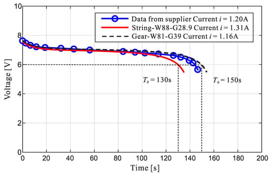 Figure 10 shows the discharge curve of two batteries B1 connected in series. The ∘ indicate the data from the manufacturer for A and the continuous lines correspond to the best-fit Shepherd model [] for the requested current of the prototypes P1 and P2 (the requested current i is obtained by adding the current needed for the board and attitude servos to the values given in the third column of Table 4, A). The minimum voltage to operate the control board and the servos is 6 V, so the expected operating time with a constant current is obtained when the Shepherd model drops below 6 V.