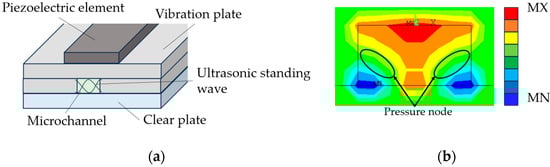 Figure 1a displays the straightforward configuration of the device. Within the microchannel, a standing wave acoustic field is generated, resulting in the formation of pressure nodes. Figure 1b illustrates the results of the finite element method analysis, depicting the pressure distribution across the cross-section of the flow channel within the droplet manipulation device used in this study. This figure specifically zooms in on the cross-sectional view of the channel, as analyzed by the two-dimensional model; the red areas in the diagram show the positive maximum pressure, and the blue areas show the negative maximum pressure. Droplets accumulate at the nodes highlighted in green in this figure, driven by the acoustic radiation force [,,]. The magnitude of the acoustic radiation force acting on each droplet is contingent on its size. Consequently, larger droplets cover longer distances, while smaller ones tend to remain relatively stationary. This disparity facilitates the manipulation and separation of the droplets based on their sizes.