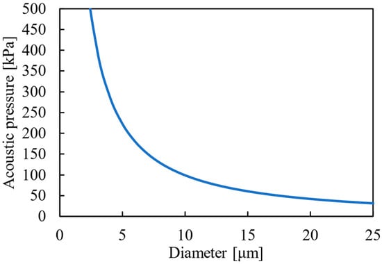 From Equations (1)–(6) for the acoustic radiation force, , and Equation (7) for the viscous force, , the sound pressure values required to manipulate the droplet, which encompasses each droplet’s diameter, can be calculated. The relationship between the sound pressure value required to focus the polystyrene particles and the radius of the particles is shown in Figure 2, and the parameters and physical properties used in the estimation are shown in Table 1. This indicates that particles that encompass a diameter larger than 10 µm can be manipulated by applying a pressure higher than 99.8 kPa in the channel.