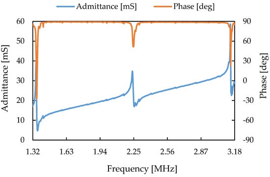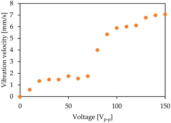 As detailed in this section, the pressure on the channel is calculated from the experimental data using polystyrene particles of uniform diameter. Based on these results, the behavior of emulsion droplets was predicted. In this experiment, a solution of polystyrene particles suspended in 95% ethanol was used. Figure 3 also shows a photograph of the ultrasonic vibration device used in these experiments. This device has dimensions of mm and, as shown in Figure 4, is assembled by bolting together four plates: a vibration plate with a piezoelectric PZT attached, a microfluidic plate with a 400 µm wide and 200 µm thick microchannel, a transparent plate, and a base plate. Figure 5 shows the results of the admittance measurements performed to identify the resonance frequency of the device. Measurements of 1.32 to 3.18 MHz were retrieved, and resonance points were identified near 1.35 MHz, 2.24 MHz, and 3.14 MHz. Therefore, the experiments described below are based on the pressure distribution calculated from the frequency response analysis of the finite element method in the vicinity of these resonance frequencies and predicted frequencies. Figure 6 shows the vibration velocity measured when this device was driven at 1.35 MHz, which is predicted to represent the resonance frequency of this device. The measurement point of the vibration velocity is the center of the glass plate on the backside of the device, as shown in Figure 3b. When the device was driven at 100 , a value of 6.9 mm/s was obtained. We conducted our manipulation experiments using polystyrene particles to calculate the sound pressure applied to the channels in the device. The experimental setup is shown in Figure 7.