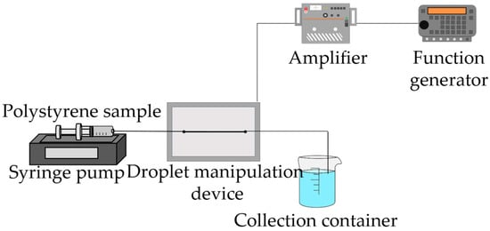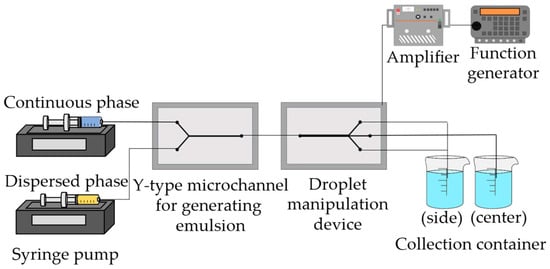As shown in Figure 15a,b, a microfluidic plate was fabricated, and experiments were conducted using devices stacked in the same configuration as in Figure 4. The channel width of this channel plate is 400 µm, and the channel constriction section is 30 µm. The experimental setup of these experiments is shown in Figure 16. First, emulsion is generated by the shear force of the continuous phase using microchannels with Y-shaped channels. The emulsion is then pumped into a droplet manipulation device, and the droplet manipulation is observed under an optical microscope.