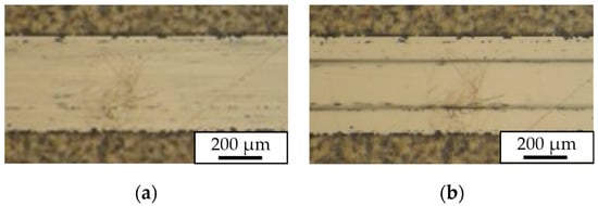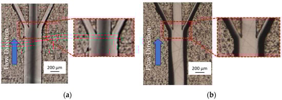 Photographs of experimental results of particle manipulation when the flow rate was 100 µL/min; (a) µm polystyrene particles. (b) µm polystyrene particles.