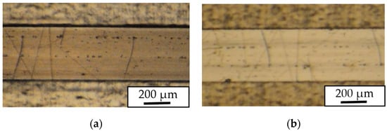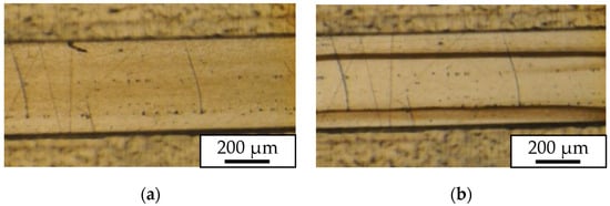 Polystyrene particles of 10 µm were used in these experiments. Manipulation experiments with polystyrene particles were carried out using 95% ethanol as the solvent. The flow rate of the syringe pump was set at 100 µL/min; the driving frequency of the device was set to 3.14 MHz; and the applied voltage to the piezoelectric element was 100. Figure 8 shows the appearance of the flow path during the experiment. The polystyrene particles were focused on the flow path, forming two lines. The time from the start of the voltage application to the device until the polystyrene particles converged was measured. The result we obtained was 0.602 s, and the pressure value in the channel was calculated backwards from the balancing relationship between Equations (6) and (7) to be 131 kPa. As mentioned earlier, the pressure required to focus the polystyrene particles at 10 µm was 99.8 kPa, and the estimated sound pressure in the channel was larger, suggesting that it was possible to focus the polystyrene particles in the microchannel. The comparison of the estimated sound pressure values with the graph in Figure 2 revealed that polystyrene particles larger than 8 µm in diameter can be manipulated in this experiment.