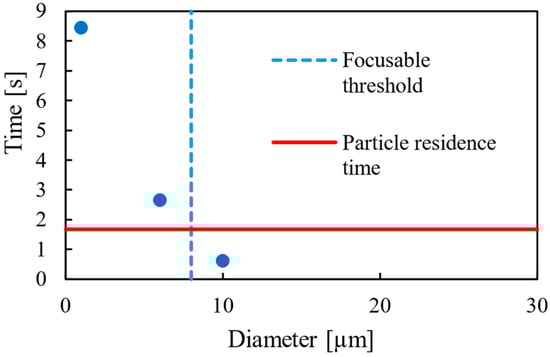 The device was also driven under similar conditions using 1 µm and 6 µm polystyrene particles. As shown in Figure 9a, the 1 µm polystyrene particles hardly moved. As shown in Figure 2, this is because the pressure in the channel did not meet the pressure required for focusing 1 µm polystyrene particles. On the other hand, the 6 µm polystyrene particles shown in Figure 9b were observed to converge to the pressure nodes when the voltage was applied. However, the focusing width of the particles was larger than when the 10 µm polystyrene particles shown in Figure 9 were manipulated. Therefore, the sound pressure required to move the 1 µm and 6 µm polystyrene particles to the pressure node was considered insufficient. The syringe pump was stopped, and the device was driven to observe the 1 µm and 6 µm polystyrene particles. The appearance of the channel is shown in Figure 10. The time for the polystyrene particles to converge was measured immediately after the voltage was applied to the device. As shown in Figure 11, the 1 µm polystyrene particles focused in 8.44 s, and the 6 µm polystyrene particles focused on to the pressure nodes in 2.64 s. The results for each of the two sizes of polystyrene particles are shown in Figure 11. These results indicate that stopping the flow enabled acoustic focusing of the 1 µm and 6 µm particles, but the particles stayed in the channel for 1.64 s when they were pumped at 100 µL/min, suggesting that the pressure was insufficient to manipulate the particles under the device driving conditions in this experiment. Based on these experimental results, sufficient pressure must be applied to the channel for the desired diameter range to classify the particles, and the distance traveled by the particles should be considered when designing the device.