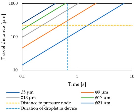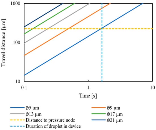 In this section, the behavior of emulsion droplets is predicted with the aim of classifying these droplets according to their diameter. The emulsions used were the 1 wt% SDS solution for the continuous phase and n-dodecane for the dispersed phase. To realize droplet manipulation using a bifurcated channel, the droplet must travel at least 224 µm, the distance from the center of the channel to the pressure node, during the time that the acoustic radiation force acts on the droplet. The time during which the acoustic radiation force acts on the droplet is the time between the droplet’s entry into the channel and its arrival at the branching channel. As the distance in this range is 35.8 mm, the time for the acoustic radiation force to act on the droplet was calculated to be 1.64 s. Figure 12 shows the relationship between the droplet size and distance traveled, and Table 2 and Table 3 show the parameters and physical properties used in our estimations. The vertical blue dashed line in the diagram shows the time for the acoustic radiation force to act on the droplet, while the horizontal yellow dashed line indicates the travel distance required for droplet manipulation. From these graphs, droplets with diameters larger than 5 µm can obtain the required travel distance.