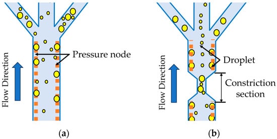 Figure 17 shows the effect of the ultrasound application on droplet manipulation. Prior to applying the ultrasound application, relatively large droplets, shown in black in Figure 17, are concentrated in the center of the channel by the constriction. Small droplets are difficult to examine but are concentrated in the center of the channel as well as the large droplets. In contrast, when ultrasound is applied, as shown in Figure 1, a node of sound pressure is formed, and the droplets are subjected to the acoustic radiation force, resulting in the observed large droplets being collected in the bifurcated channels on both sides.