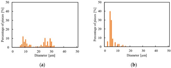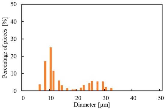 The experimental conditions were as follows: the flow rates of the continuous phase (1 wt% SDS solution) and the dispersed phase (n-dodecane) were 100 µL/min and 2 µL/min, respectively. The driving frequency of the droplet manipulation device was 2.25 MHz, and the applied voltage was 120 . The emulsions collected from each channel after the droplet manipulation process were observed, and the droplet diameters were measured using image analysis software. Figure 18 shows the measured droplet diameters of the emulsions generated by the Y-type microchannel in Figure 16. Figure 19 shows the droplet diameter distributions of the emulsions collected in the channels on both sides and in the central channel, respectively, after the droplet manipulation process using the microchannel without a constriction. Compared with the droplet diameter distribution in the emulsion before the operation, the emulsion collected from the central channel contained more droplets with diameters of 20 µm or less. The droplet diameters of the emulsions collected from the channels on both sides were polydispersed compared to the droplet diameters of the emulsions collected from the central channel.