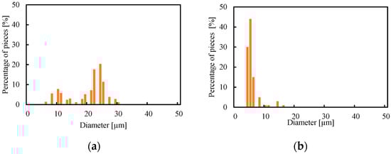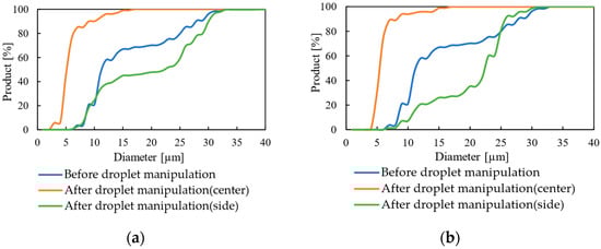 To clarify the effect of the microfluidic channel with a constriction, Figure 21 shows graphs comparing the number of droplets in the emulsion before the operation and the number of droplets in the recovered emulsion, using the amount of the ratio integrated from the smallest diameter to the largest. The side and center mean locations of the collected droplets are depicted in Figure 16. The emulsion collected at the center of the channel after droplet manipulation had a droplet content of 94% with a diameter of 9 µm or less, while the emulsion collected from the channels on both sides after manipulation had a droplet content of 7%. Furthermore, the 21% content of droplets smaller than 9 µm in the emulsion prior to their manipulation suggests that droplets larger than 9 µm could have been manipulated. This result is consistent with the theoretical value derived in Figure 14. The effect of the microchannel with a constriction was also observed, as the emulsion collected in the center of the channel after droplet manipulation had a droplet content of 90% for droplets smaller than 9 µm and 18.4% for emulsions collected from the channels on both sides after the manipulation.