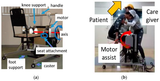 - Wu, J.; Shino, M. Development of Transfer Assist Equipment by Lower Back Burden Reduction Method of Caregiver. In Proceedings of the 2018 IEEE International Conference on Robotics and Biomimetics (ROBIO), Kuala Lumpur, Malaysia, 12–15 December 2018; pp. 691–696. [Google Scholar]
