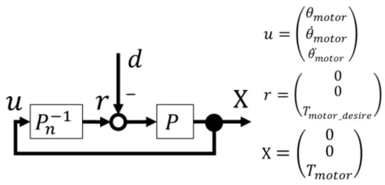 Block diagram of the proposed collaborative assistive algorithm. represents the input, is the command value, is the output, is the disturbance, represents the plant (caregiver, elderly, motor, seat), and is the nominal model of the plant that determines the target value . The variables , , and represent the rotation angle, rotation angular velocity, and rotation angular acceleration of the motor, respectively. is the motor torque, and is the motor torque that satisfies the ideal conditions.