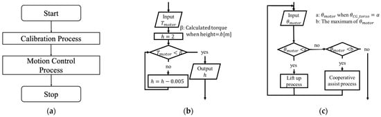 Figure 4 illustrates the flow of the proposed control algorithm. The control system consists of two processes: the Calibration Process and the Motion Control Process. In the Calibration process, the motor torque to maintain the elderly person in the seated state is obtained from the measured motor current. By comparing this value with the estimated holding torque in the range of heights below 2 m, the height h is set as the elderly person’s height using the nearest value. In Motion Control process, motor operation control is performed. Simply raising the seat automatically can be considered a motor operation control method to reduce the caregiver’s lumbar burden. However, to support the elderly in standing up freely at the caregiver’s timing while holding them, it is important for the device to provide collaborative assistance by responding to the caregiver’s force input, not just by automatically raising the seat. Considering the ideal condition of reducing the caregiver’s lumbar burden, we propose modifying the operation based on the caregiver’s trunk forward tilt angle . A threshold for is determined from the quantitative evaluation index of the lumbar burden factor, as detailed in Section 4.3. When is in the range of or above, the automatic lift algorithm (Lift up) is implemented. On the other hand, when is below , the collaborative assistive algorithm (Torque assist) is applied.