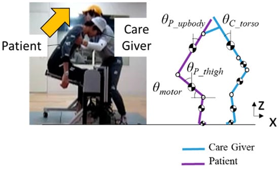 The effectiveness of the Motion Control Process is defined as “the proposed control algorithm ensures that does not exceed 3400 N in the range where is smaller than during the stand-up assistive movement of the caregiver”. The subjects included two students (height 1.73 ± 0.08 m, weight 61.0 ± 8.0 kg), who alternately played the roles of caregiver and elderly person in the experiments.