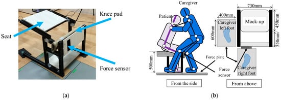 The experimental setup included the use of a mock-up, as well as schematic diagrams illustrating the subjects’ posture, placement of items, etc.: (a) appearance of mock-up; (b) position of subjects and mock-up.