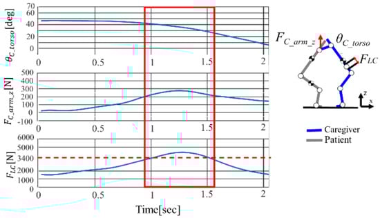 The transfer movement by one caregiver using the front holding method is two-dimensional []. Therefore, the dominant term in Equation (4) is the forward bending moment on the caregiver’s waist. Equation (5) presents the expression for calculating the forward bending moment .
