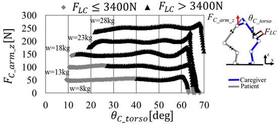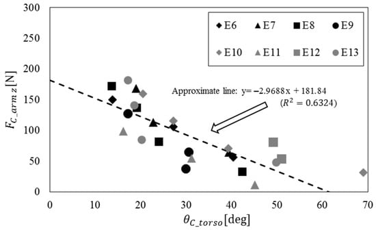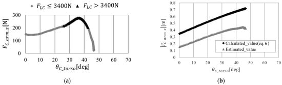 When comparing the theoretical and experimental values in Figure 8b, there is a difference in the y-intercept, which can be attributed to the assumption in the theoretical value calculation, where the distance along the x-axis from the caregiver’s shoulder joint to the gripping point was considered as the upper arm length, but in reality, it is shorter than the upper arm length. Moreover, the slopes are nearly identical, and as the theoretical value’s variable is , it can be inferred that and are dependent variables.