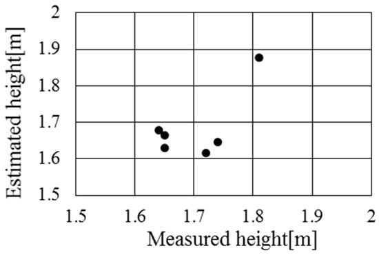 The effectiveness of the Calibration Process is defined as “whether the estimated height corresponds to the measured height based on the proposed control algorithm”, and is examined. Figure 11 illustrates the relationship between the estimated height and the measured height for each subject in the Calibration Process. The subjects consisted of six students (height 1.70 ± 0.06 m, weight 61.3 ± 5.4 kg). As a result, the estimated height of the elderly was obtained with an accuracy of approximately ±0.1 m. Therefore, the Calibration Process enables the estimation of the elderly person’s height, providing valuable results for estimating the inertia term and the gravity term in Equation (1).