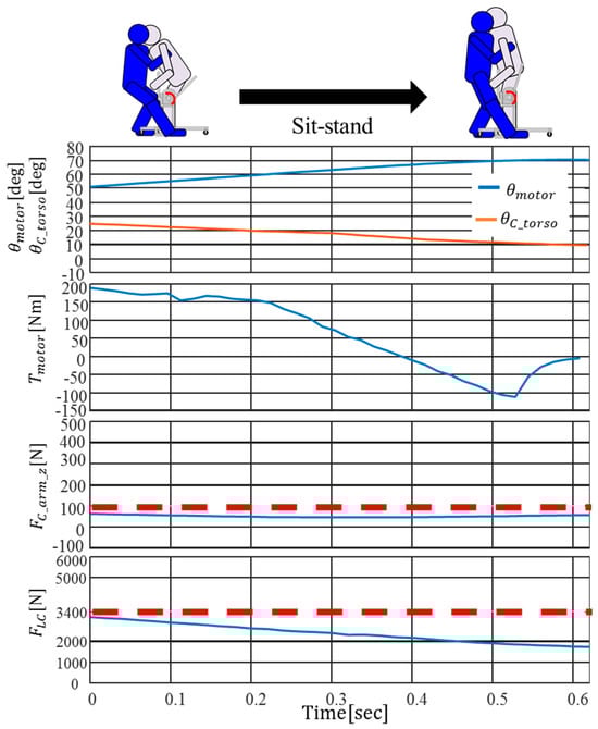 As a result, during the stand-up assistive movement, was found to be less than 100 N, and was less than 3400 N. In other words, it was confirmed that, with the proposed control algorithm, the caregiver and the device collaborate effectively to assist the elderly in standing up. Additionally, in the range of being less than , the proposed control algorithm, through the assistance of the device, resulted in being reduced, meeting the ideal conditions and confirming its effectiveness.