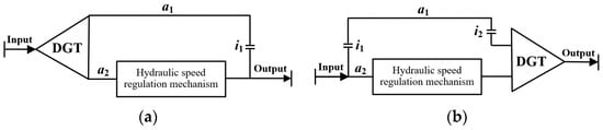 In a hydro-mechanical transmission system, the DGT can serve as both a power split device on the input side of the system and a power-combining device on the output side of the system [26]. When only one set of planetary gear exists in the system, the power-coupling form of the system can be divided into output- and input-coupling types according to the difference in the distribution position of the DGT, as shown in Figure 1.