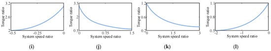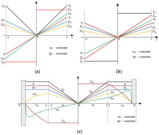 Because the pump and motor displacement regulation ranges in the CLHS are generally equal, the displacement ratio of the CLHS varies in the range of [−1, 1]. Based on Ref. [11], the partial characteristics of the CLHS are as shown in Figure 4.