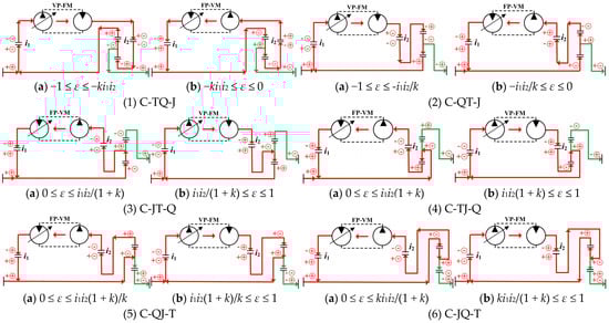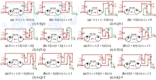 As shown in Figure 5 and Figure 6, 12 power-flow transmission states exist for each of the S-PHTS and C-PHTS. To ensure that power can be transmitted in the desired manner, the structure form, layout method, and regulation method of the CLHS should be significantly different, even in different power-flow transmission states of the same DGT connection form. Therefore, Figure 5 and Figure 6 not only analyze the power-flow, but also, accordingly, provide 24 PHTS configurations. In the PHTS, the selection of the DGT input and output elements and the displacement ratio of the CLHS collectively determine the direction of the power flow in the system. Each configuration of the CLHS must be controlled within the specified displacement ratio range; otherwise, the configuration may be ineffective.
