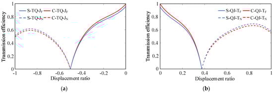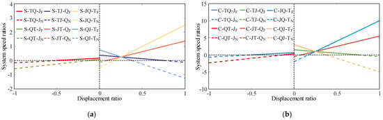 Figure 5 and Figure 6 show that, among the eight configurations shown in Figure 11, S-TQ-JF, C-TQ-JF, S-QJ-TF, and S-QJ-TF transmit power through the mechanical–hydraulic reflux transmission form, whereas S-TQ-JN, C-TQ-JN, S-QJ-TN, and S-QJ-TN transmit power through the hydraulic–mechanical reflux transmission form. Comparing the efficiency curves of the aforementioned configurations reveals that, for the same DGT connection form and displacement ratio control range, the C-PHTS configuration has higher transmission efficiency when the PHTS is configured in the mechanical–hydraulic reflux transmission form. Conversely, the S-PHTS configuration exhibits higher transmission efficiency when the PHTS is configured in the hydraulic–mechanical reflux transmission form. The closer the system speed ratio is to zero, the smaller the difference in efficiency between the C-PHTS and S-PHTS becomes. Note that, while Figure 11 only randomly presents two types of DGT connection forms, the aforementioned rules are valid for any DGT connection form of the PHTS.