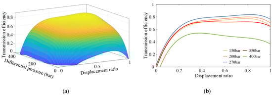In this study, a CLHS composed of a variable displacement axial piston pump and a fixed-displacement axial piston motor (rated displacement of 125 cm3/r) is used as an example. The interpolation method was used to fit the transmission efficiency, and the functional relationship among the transmission efficiency of the CLHS, system differential pressure, and displacement ratio was determined.
