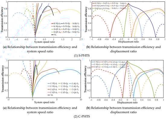 Ref. [31] shows that when the rated displacements are equal, the displacement regulation method has a minimal effect on the transmission efficiency of the CLHS. Therefore, Equation (14) was uniformly used as the efficiency model of the CLHS in the calculation of the PHTS configuration. Referring to the efficiency calculation methods for S-TQ-JN, the transmission efficiency characteristics of the remaining PHTS configurations can be calculated as listed in Table 2.