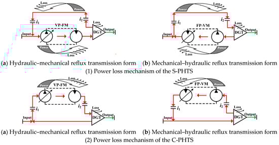 Because the C-PHTS and S-PHTS have different configurations, their power loss mechanisms should be different. As shown in Figure 5 and Figure 6, both C-PHTS and S-PHTS have two reflux transmission forms. The power loss mechanism of the PHTS in different reflux transmission forms is shown in Figure 10.