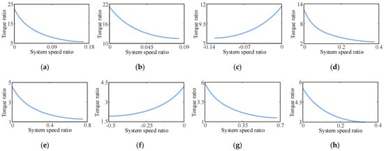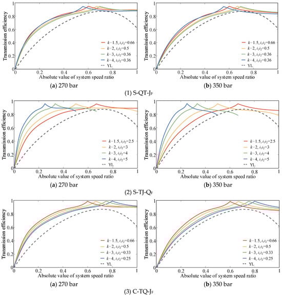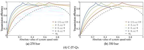 The transmission efficiencies of S-QT-JF, S-TJ-QF, C-TQ-JF, and C-JT-QN are relatively high. Even at the lowest efficiency of the CLHS, these four configurations have higher transmission efficiencies within the same speed ratio range compared with the torque converter. However, the speed ratio upper limits of these configurations remain small, and there is a problem of narrow high-efficiency areas. Therefore, simply applying the reflux transmission mode to the transmission system is insufficient. To widen the high-efficiency range of the system without increasing the number of vehicle gears, it is necessary to expand the CLHS displacement ratio control range (switching to bidirectional CLHS) in practical applications and use the split transmission mode to increase the system speed ratio’s upper limit. Considering as an example the advantageous configurations shown in Figure 13, the efficiency characteristics of the configurations after expanding the CLHS displacement ratio control range are as shown in Figure 14.