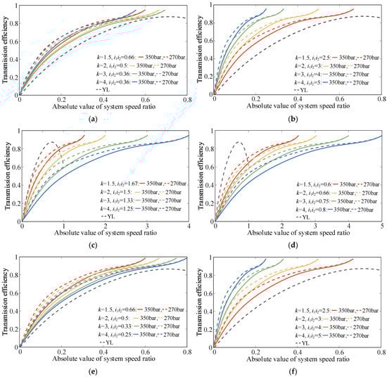 Figure 7 reveals a linear relationship between the system speed ratio of the PHTS and the displacement ratio of the CLHS. The PHTS possesses the largest speed regulation range when the sun wheel is connected to the output shaft of the system. In contrast, it has the smallest speed regulation range with the planetary carrier as the output shaft. If the displacement ratio is sufficiently large, the speed ratios of the same type of configurations will be equal at a certain displacement ratio.