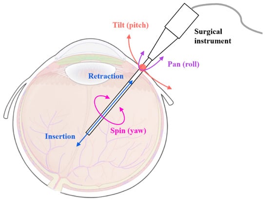 During MIOS, surgical instruments are inserted into the eye through a scleral incision, and various operations are performed through and about this incision throughout the procedure. As shown in Figure 1, since the diameter of the scleral incision is extremely small, it can be considered to be a point; thus, the motions of the surgical instruments can be described as pan–tilt–spin rotations (or roll–pitch–yaw motions in kinematics) centered at the incision point and an axial translation for the insertion and retraction [3]. A remote center of motion (RCM) mechanism is proposed in response to the above characteristics of MIOS. The RCM mechanism restricts the movement of the ends of surgical instruments around a fixed point where no physical structure exists. Robots based on the RCM mechanism are considered more suitable for MIOS than conventional muti-joint robots, as they generate RCM points using mechanical structures and thus have reduced degrees of freedom (DOF) and decoupled motion [4].