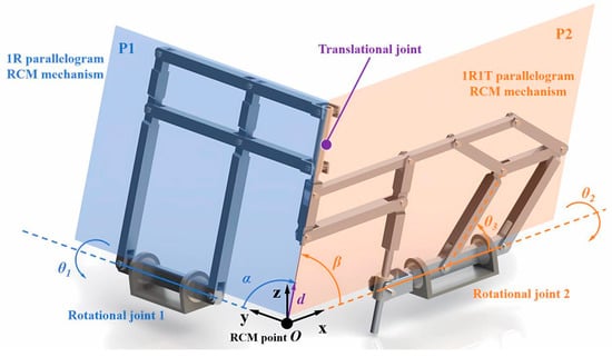 As shown in Figure 2, the proposed spatial RCM mechanism consists of two different planar parallelogram mechanisms, and the working planes of both mechanisms can perform rotation with the control of the rotational joints (R-joint) mounted at the base. In this mechanism, the rotation within the plane of each planar mechanism is passive and driven by the rotating joint of the other mechanism.