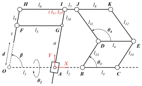 In addition to the parameters indicated in Figure 2, mechanism configuration parameters include linkage lengths l1……l26 and angle θ4. The length of the end surgical instrument (generally a surgical needle) is indicated as t. In particular, the distance between A and G is denoted as a, which is a variable length due to the translational joint at point A. Finally, for follow-up calculations, a coordinate frame is established at point A, and the coordinates of point I are expressed as .