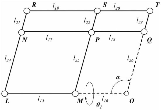 Annotated illustrations of the two planar mechanisms are provided in Figure 4 and Figure 5 for further analysis of the kinematics. Points of interest are indicated with capital letters, namely, joints A, B, C, D, E, F, G, H, I, J, K, L, M, N, P, Q, R, S, and T. All of them are rotational joints except for A, which is a joint containing both translational and rotational motions. The two mechanisms share the same point O, namely, the RCM point O in Figure 2.
