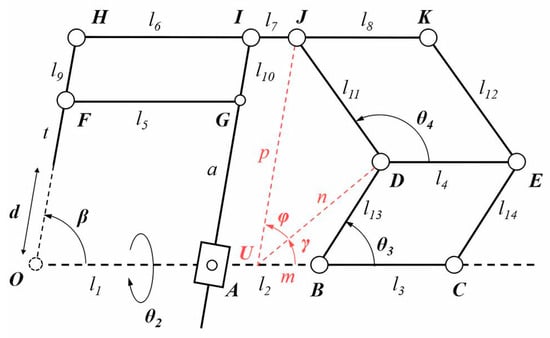 As shown in Figure 6, an auxiliary line is added to help calculate the forward kinematics, and this is parallel to IA and intersects OC at point U. In addition, length parameters m, n, and p are added to denote the lengths of UB, UD, and UJ, as well as two angle parameters, denoted by γ and φ.
