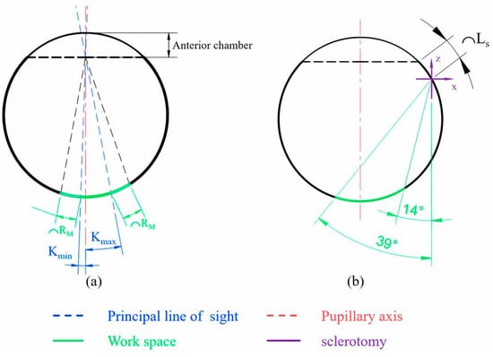A coordinate system was established at the scleral incision with the negative direction of the Y-axis as 0°. Based on ocular anatomy and ophthalmology statistics, the length of the anterior chamber is taken as 3.6 mm, Kmin as 2°, Kmax as 11°, RM as 3 mm, and LS as 3.2 mm [33,34,35,36]; then, the workspace coverage of the surgical instrument can be obtained as 14° to 39°.