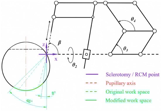 As shown in Figure 8, the 1R1T plane mechanism is kept coplanar with the eye section and the scleral incision is set as the RCM point. Considering the error in practical application, a margin of 50% is added to the previous workspace range, and the modified range is from 8° to 46°, which gives a range for β from 44° to 82°.