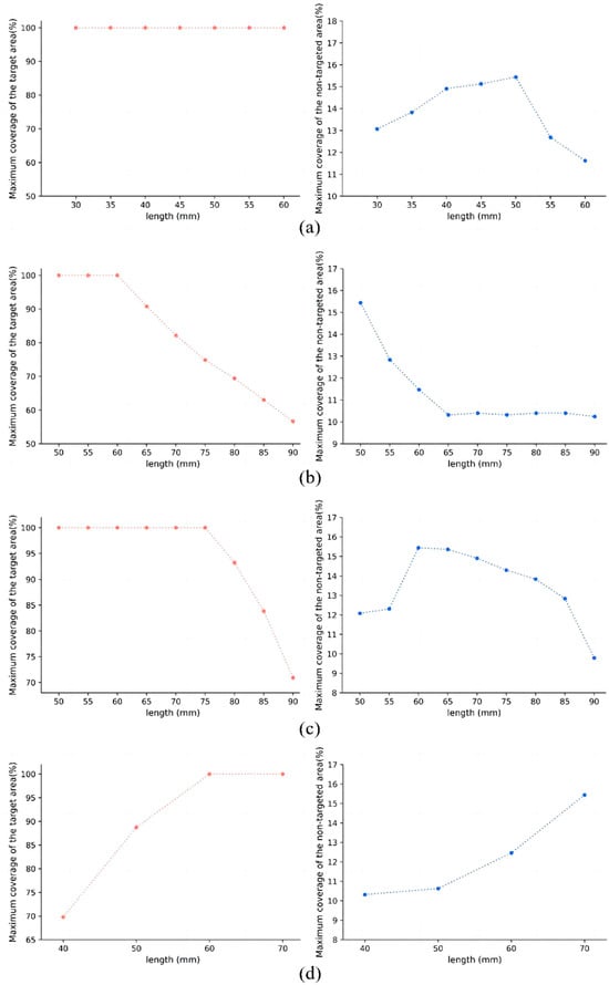 Maximum coverage of each parameter at different values. (a) Maximum coverage of the target area and non-targeted area with l2 at different values; (b) maximum coverage of the target area and non-targeted area with l11 at different values; (c) maximum coverage of the target area and non-targeted area with l13 at different values; (d) maximum coverage of the target area and non-targeted area with t at different values.