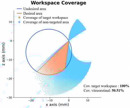 When the required coverage of the target workspace is set to 90%, a total of 87 out of 2268 configurations meet the requirement. The non-targeted vitreoretinal area coverages of these configurations were ranked, and the optimal configuration was identified as: