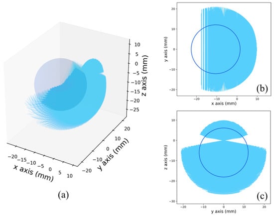 The 3D workspace is represented by a spatial point cloud, which is generated based on the forward kinematics given in Equations (2) and (3), and the discretization step of angles θ1, θ2, and θ3 is set to 0.5° in the simulation. The simulation result is shown in Figure 11a, where the peripheral scatter points have been removed for brevity. Figure 11b,c show the projections of the 3D workspace in XY and YZ planes. It can be seen that the workspace of the mechanism has a sufficiently large coverage inside the eye; therefore, the mechanism can be considered to meet the requirements of the general vitreoretinal surgery for the workspace coverage.