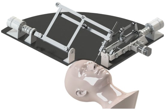 To validate the design, a prototype was built based on the final mechanism, as shown in Figure 12. The prototype has three DOF and is controlled by three motors. Note that the end of the prototype is not a real surgical instrument but a 3D printed plastic needle. A schematic diagram of the usage method of the mechanism is shown in Figure 13 with an equal proportion model of the human head.